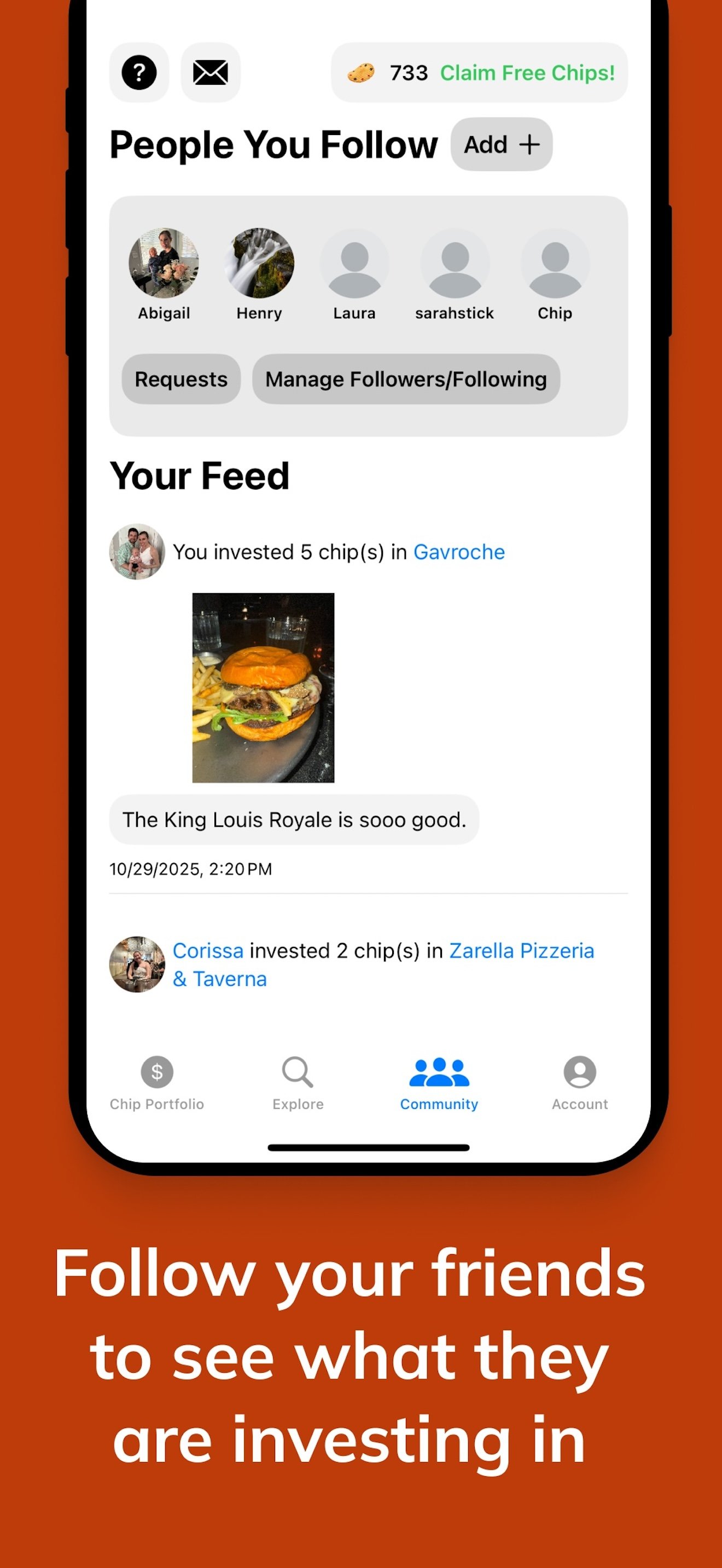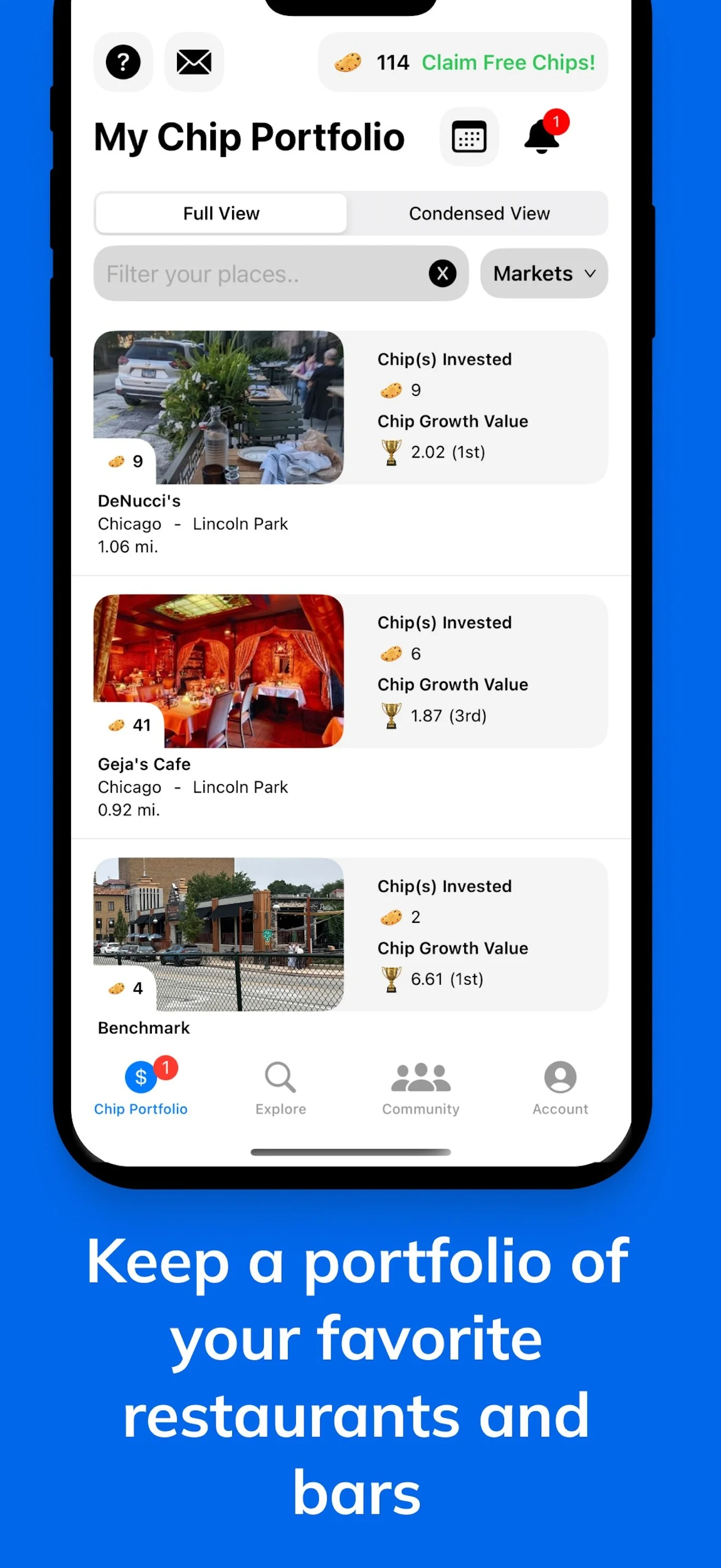 Chips allows you to connect with your favorite restaurants & bars, while also supporting them like never before. Invest, interact with, and explore local places with Chips. Make your first investment today!