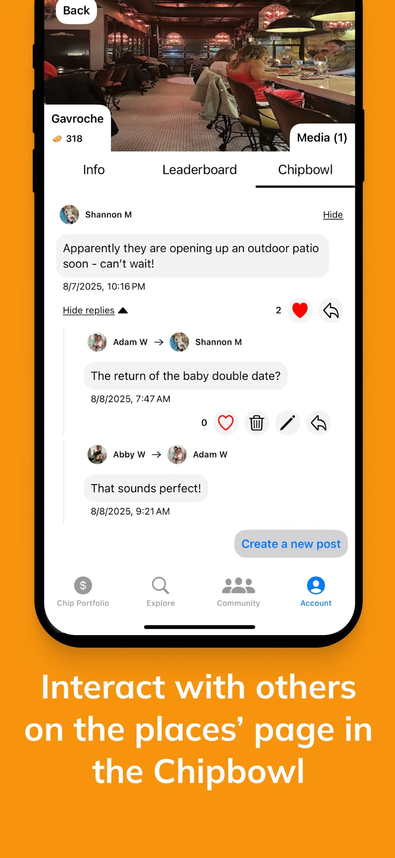 The chipbowl is a message board that allows all investors to interact directly with eachother. Post images, videos, or messages. Another perk - restaurant/bar owners can directly reach out to their most loyal customers via the Chipbowl!